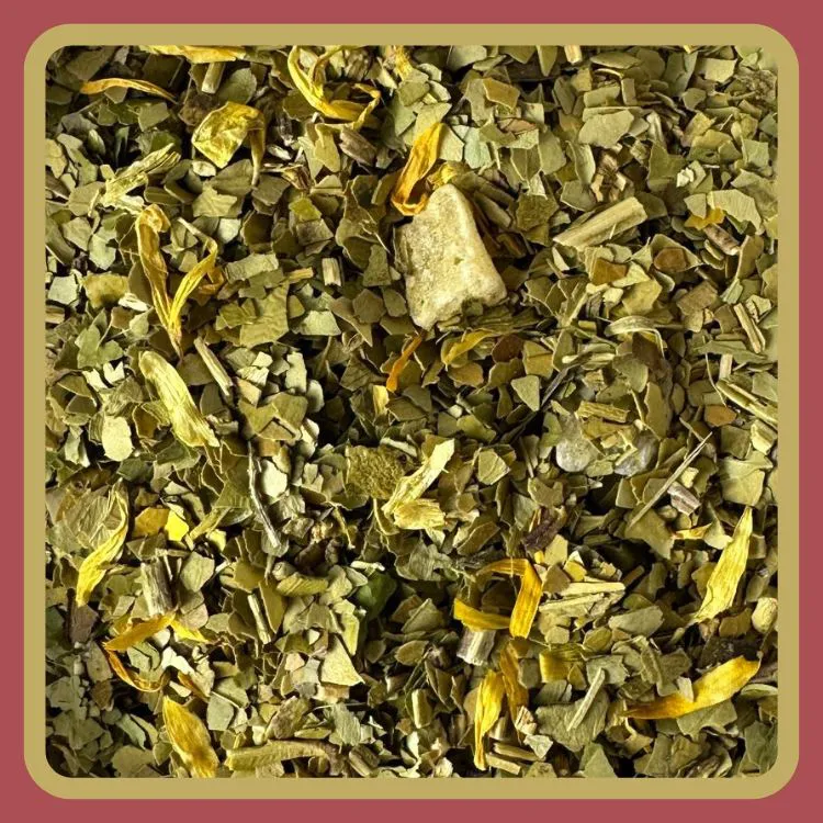 Ingrédients : Maté vert, ananas (ananas, sucre), mangue (mangue sucre), écorces de citron, arôme naturel, fleurs de souci.